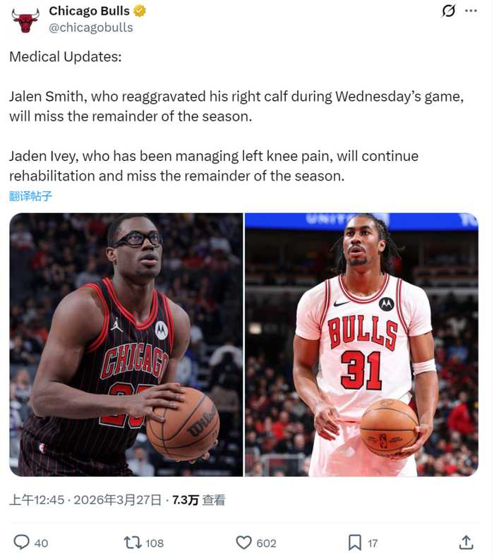 北京时间3月27日,芝加哥公牛官方宣布:杰伦-史密斯右小腿伤势复发,将缺席本赛季剩余比赛;杰登-艾维一直受到左膝疼痛的困扰,继续进行康复治疗,同样赛季报销。今年交易截止日之前,艾维被活塞送到公牛,他在公牛只打了4场比赛。